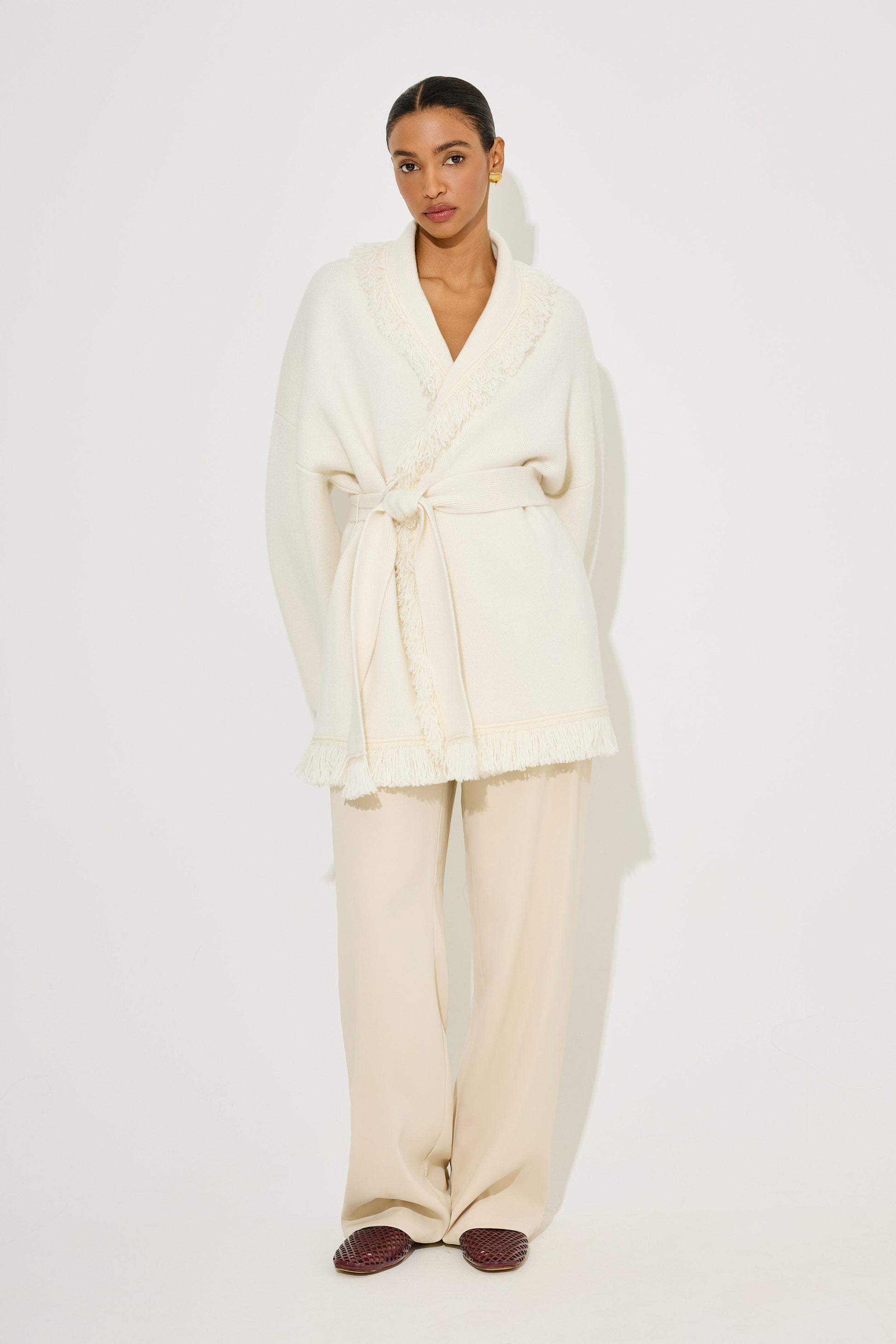 Frędzle, Które Poruszają Się Razem Z Tobą: Detale z frędzlami dodają subtelnego poczucia ruchu, które sprawia, że każdy krok jest dynamiczny. Sprawia, że klasyczny kardigan staje się wyrazisty, a jednocześnie nie wydaje się przesadzony.