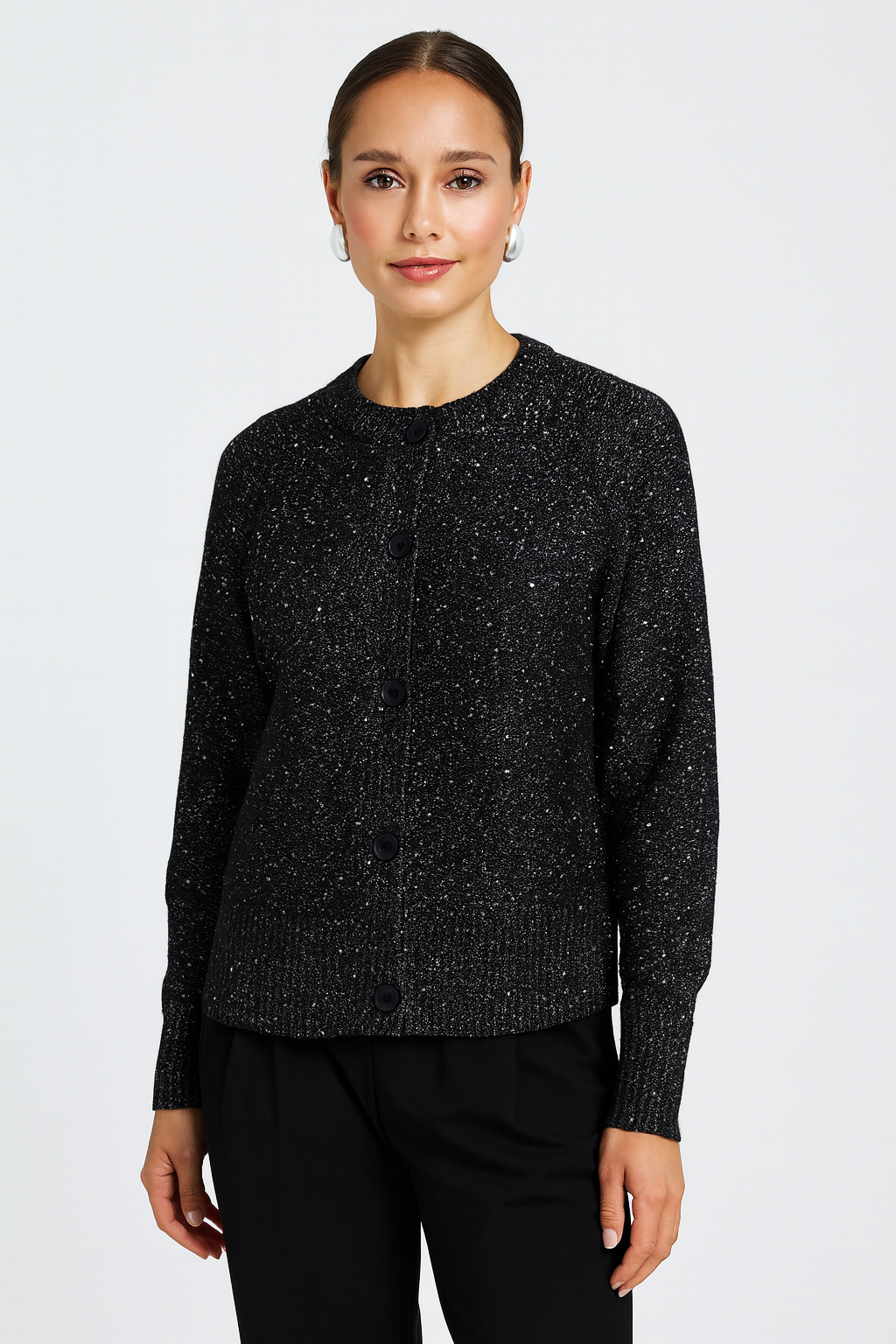 Wyrafinowane Połyskujące Detale: Subtelnie połyskujące nici dodają delikatnego blasku, który podkreśla wygląd, nie przytłaczając go. Ten detal sprawia, że kardigan jest wyjątkowy, a jednocześnie łatwy do noszenia na co dzień.